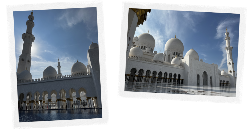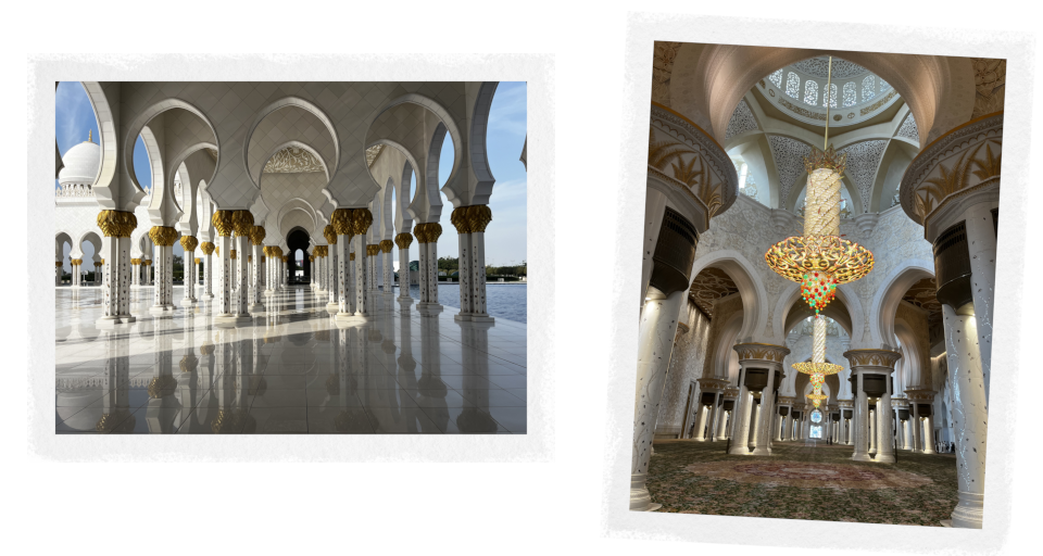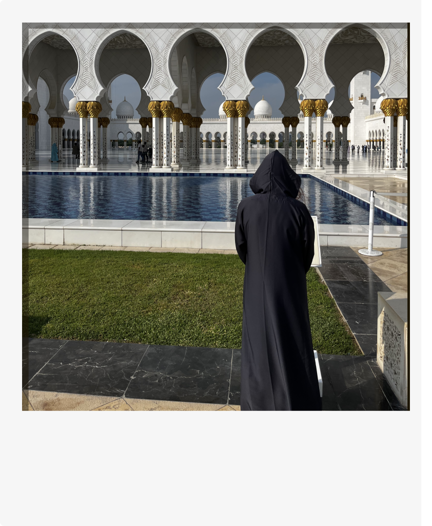 Auf einer massiven und überfüllten Autobahn fahren wir an großen, einheitlichen Wohnblöcken vorbei. Sie wirken wie über Nacht aus dem Boden gestampft; massive, dickwandige Gebäude, beinahe makellos, die aussehen wie aufeinandergestapelte Boxen. Gefühlt ist alles strahlend hell. Ich weiß nicht, ob es der Smog ist oder der Sand, der in der Luft hängt, aber über allem liegt ein milchiger Schleier, der die Gebäude am Horizont wie im Nebel verschwinden lässt. Die große Scheich-Zayid-Moschee am Rande der Stadt taucht in der diesigen Luft neben der Autobahn wie eine Fata Morgana auf, sie wirkt in ihrer makellosen Pracht vollkommen surreal.