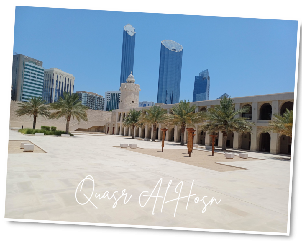 Irgendwie macht das alles nicht den Eindruck, als ob man hier auf Parkbänken oder im Gras döst. Wir überlegen kurz, ob wir „where to find green in Abu Dhabi“ googeln sollen, geben dann aber auf und flüchten uns auf den Platz vor dem ehemaligen Palast Qasr Al Hosn, der ein bisschen Abstand von den dicken Straßen bietet. Wir sind von dem ganzen Beton und dem Verkehrslärm jetzt schon erschöpft. Meine Augen schmerzen von dem blendenden Weiß um uns herum.
